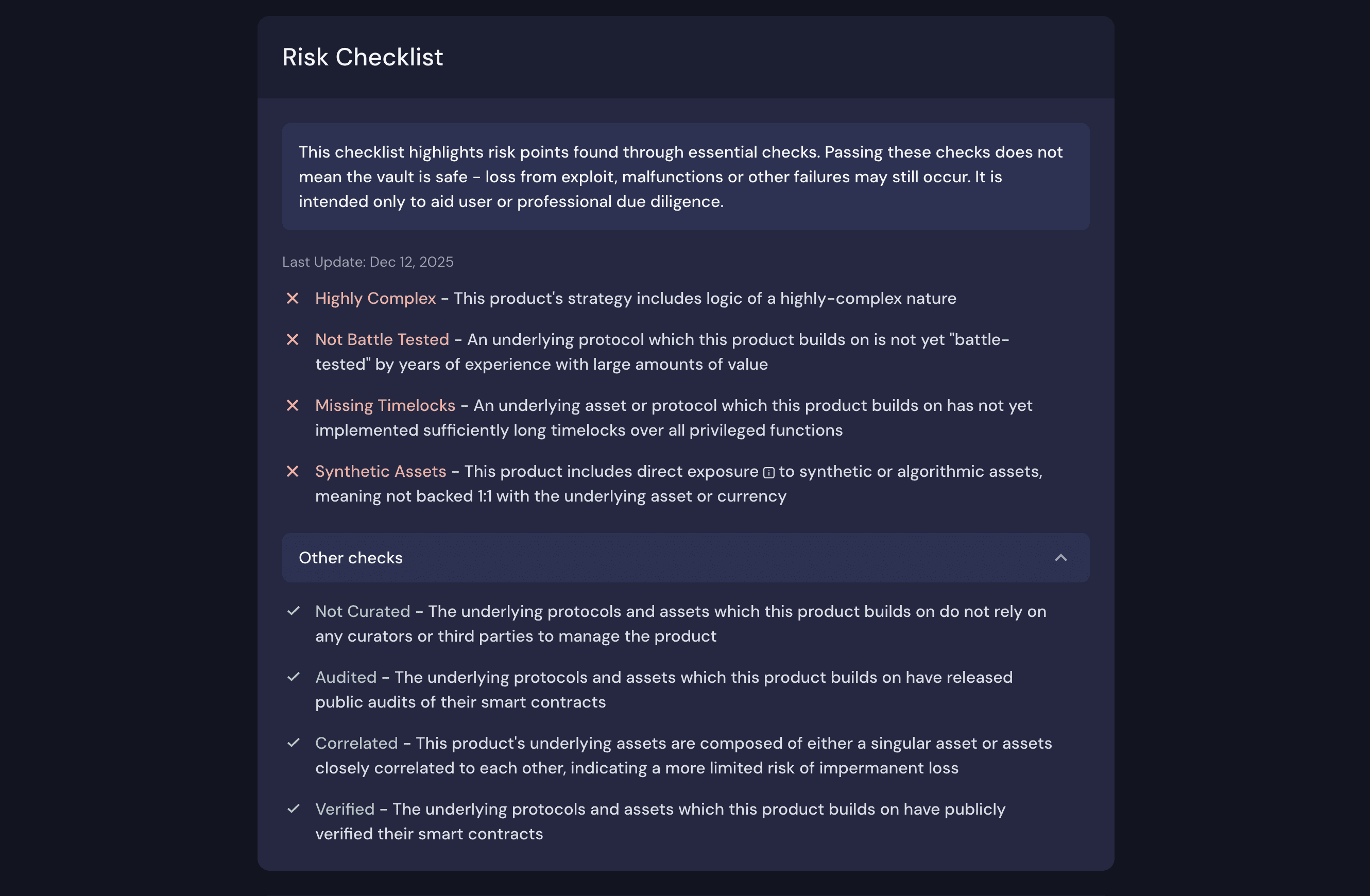 Within the checklist, we now emphasise 8 different essential checks that help us to understand the risk profile of each Beefy product: